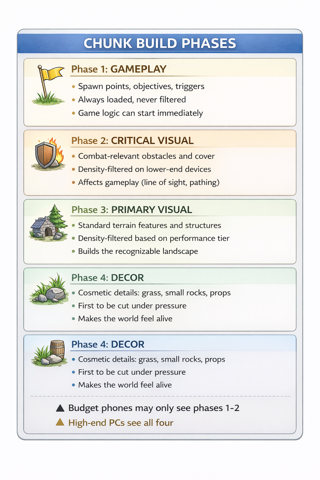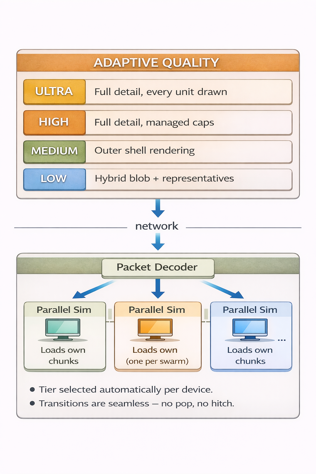 A high-end PC renders every unit individually. A budget phone shows the same swarm as a flowing mass with representative units at the edges. Same game. Same encounter. Same gameplay. Just a different level of visual fidelity — chosen automatically.