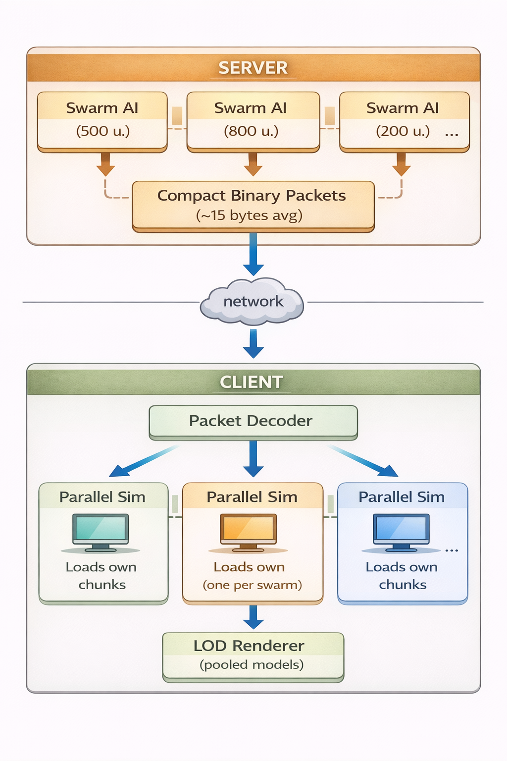 The key insight: not every unit needs to be a full citizen of the simulation. By treating groups of units as cohesive swarms rather than isolated individuals, we can make dramatically better decisions about what to compute, what to send over the network, and what to render.